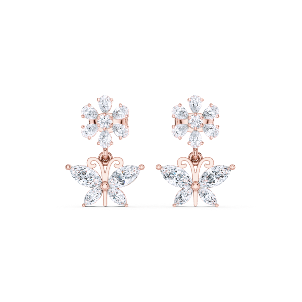 These Blossom & Butterfly Diamond Drop Earrings beautifully combine nature’s elegance with luxurious sparkle. The top features a radiant floral motif that transitions into a graceful butterfly design, all set in warm Yellow Gold, Rose Gold, White Gold. Each petal and wing is adorned with shimmering diamonds, creating a captivating harmony of charm and brilliance. Perfect for adding a whimsical yet sophisticated touch to your ensemble.