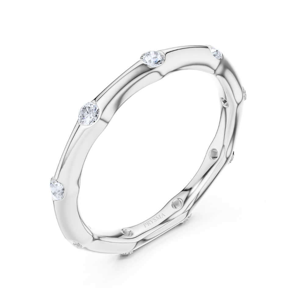 This Ringis a refined embodiment of modern minimalism and timeless elegance. Crafted in your choice of Yellow, Rose, or White Gold, it features evenly spaced round brilliant diamonds, each gracefully nestled in sleek bezel settings. Perfect for wearing alone or layered with other bands, this design exudes understated luxury, making it an essential addition to any fine jewelry collection.