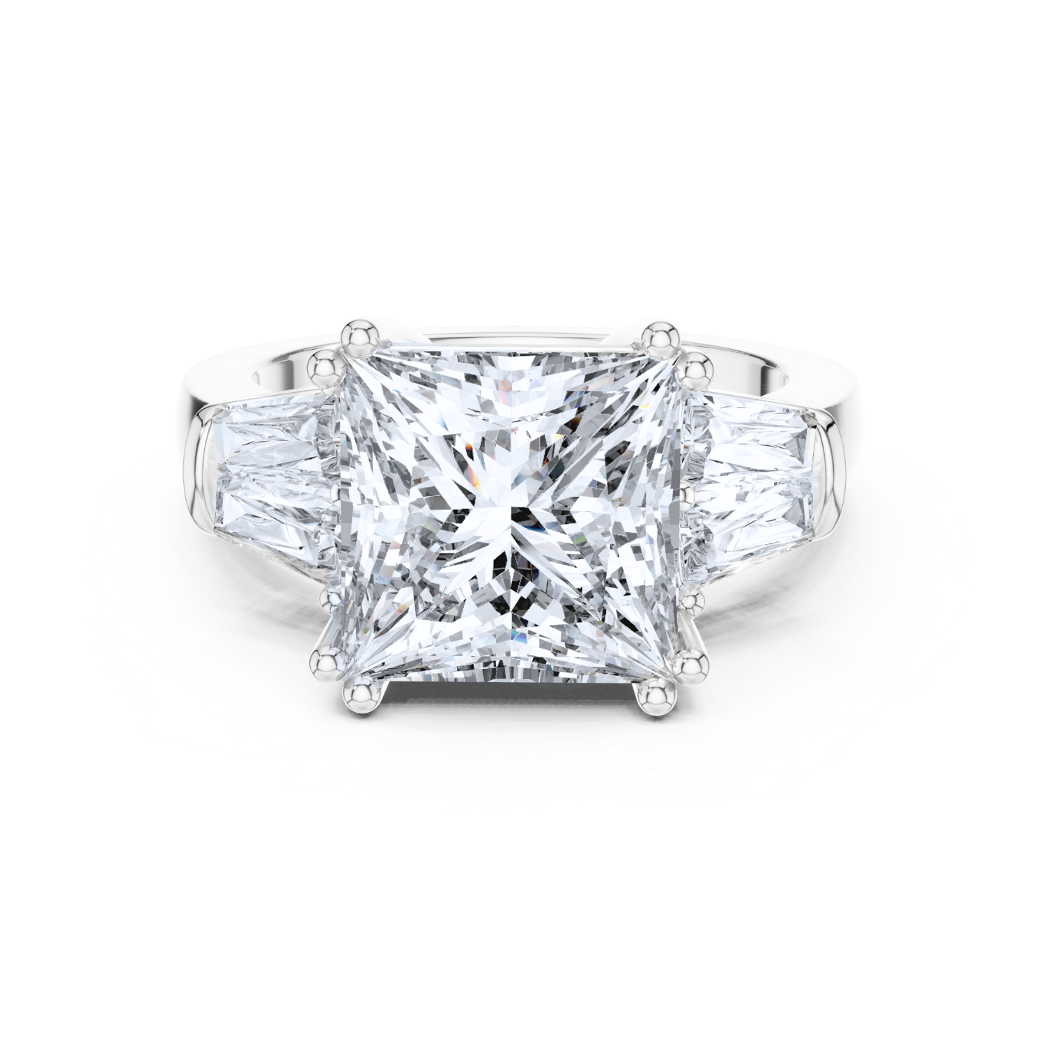 The step-cut facets of the emerald diamond create a mesmerizing hall-of-mirrors effect, exuding timeless sophistication. Flanking the center stone are two brilliant trillion-cut diamonds, enhancing its radiance and modern elegance. Crafted in [Metal Type: White Gold, Yellow Gold, Rose Gold], this stunning ring is designed for those who appreciate fine craftsmanship and sophisticated beauty.