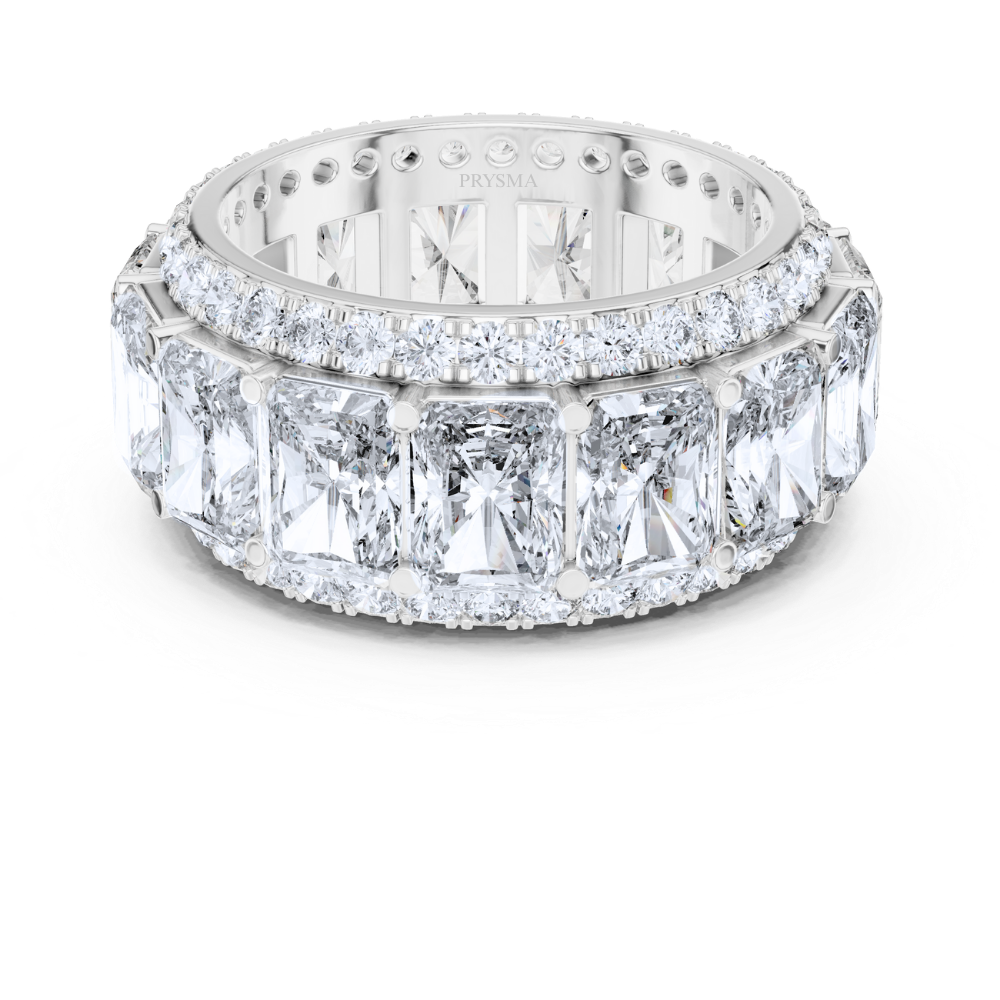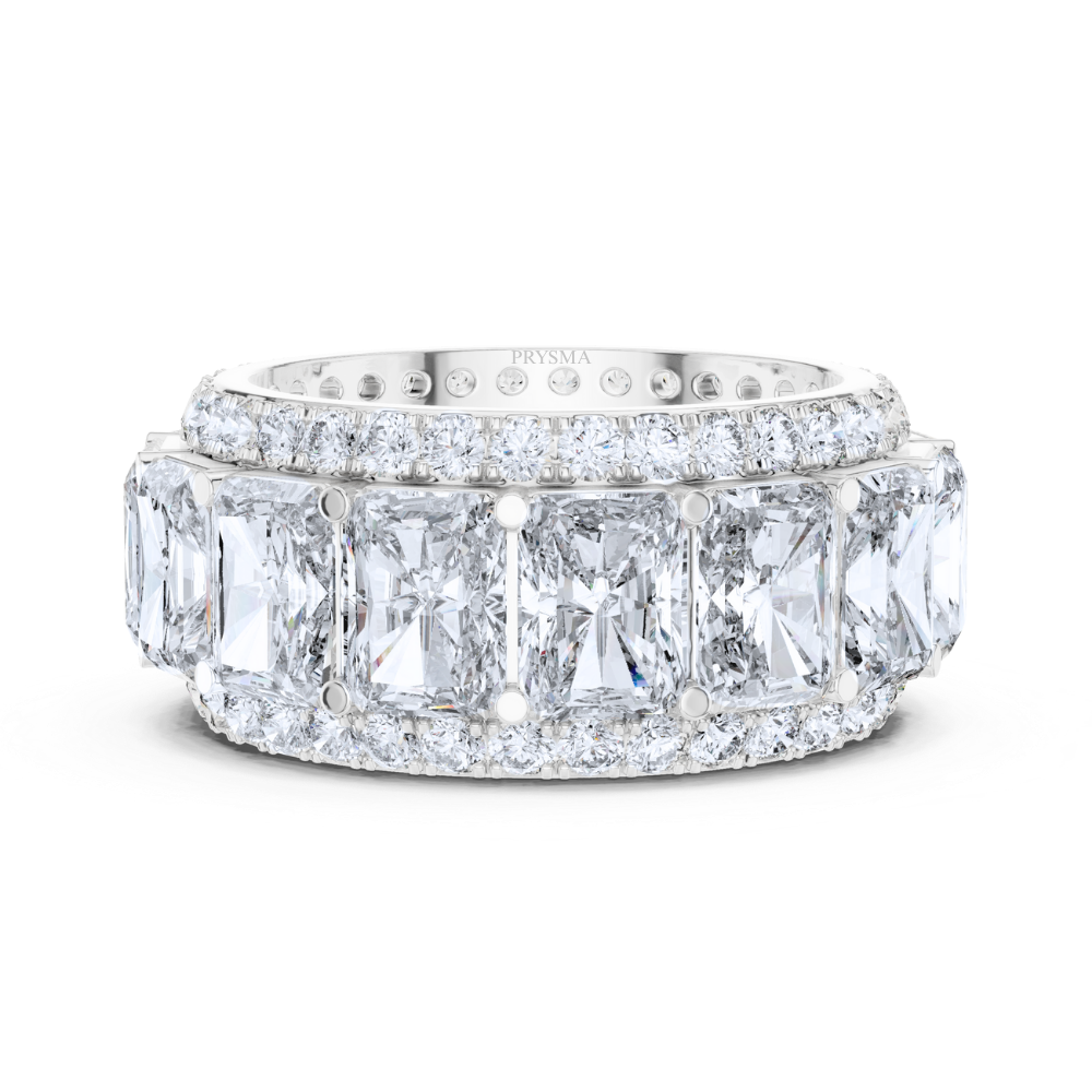 The bottom layer is adorned with a continuous row of large, rectangular stones that exude brilliance and sophistication, while the top layer showcases a sparkling halo of smaller round stones that add texture and dimension. With its high-impact sparkle and luxurious structure, this ring is a stunning celebration of elegance and grandeur — perfect for making a statement on any special occasion.