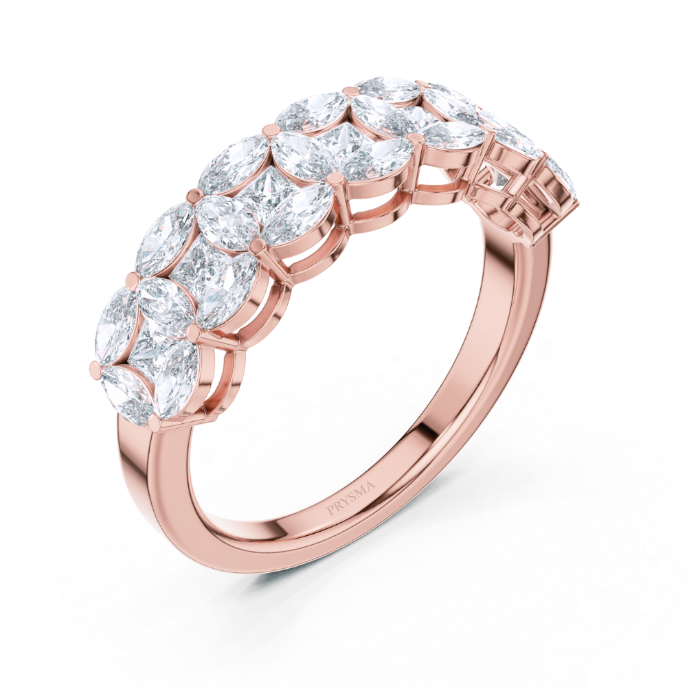 The double-row design creates a petal-like pattern that radiates elegance and brilliance from every angle. Each stone is carefully prong-set to allow maximum sparkle and symmetry, while the polished gold band provides a luxurious contrast. A perfect choice for those who appreciate floral-inspired beauty and timeless sophistication.