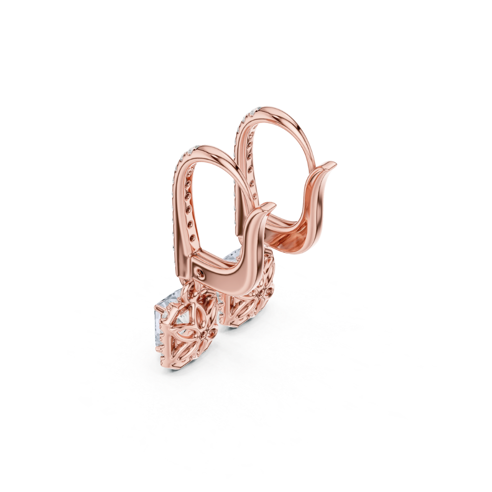 Each earring showcases a radiant-cut center diamond, known for its fiery sparkle and elegant rectangular shape. Encircled by a halo of dazzling round diamonds and suspended from a pavé-set diamond hoop, these drop earrings deliver a luminous display of light and movement. Expertly set in warm Yellow Gold, Rose Gold, White Gold, they blend modern allure with timeless sophistication—perfect for weddings, celebrations, or everyday elegance.