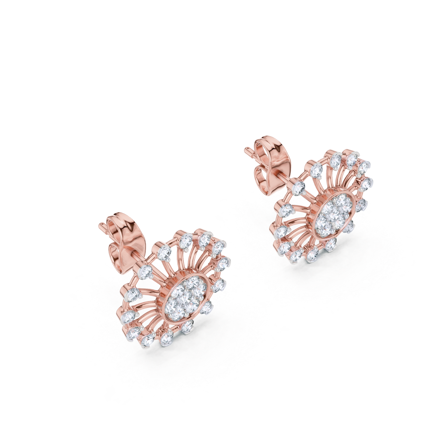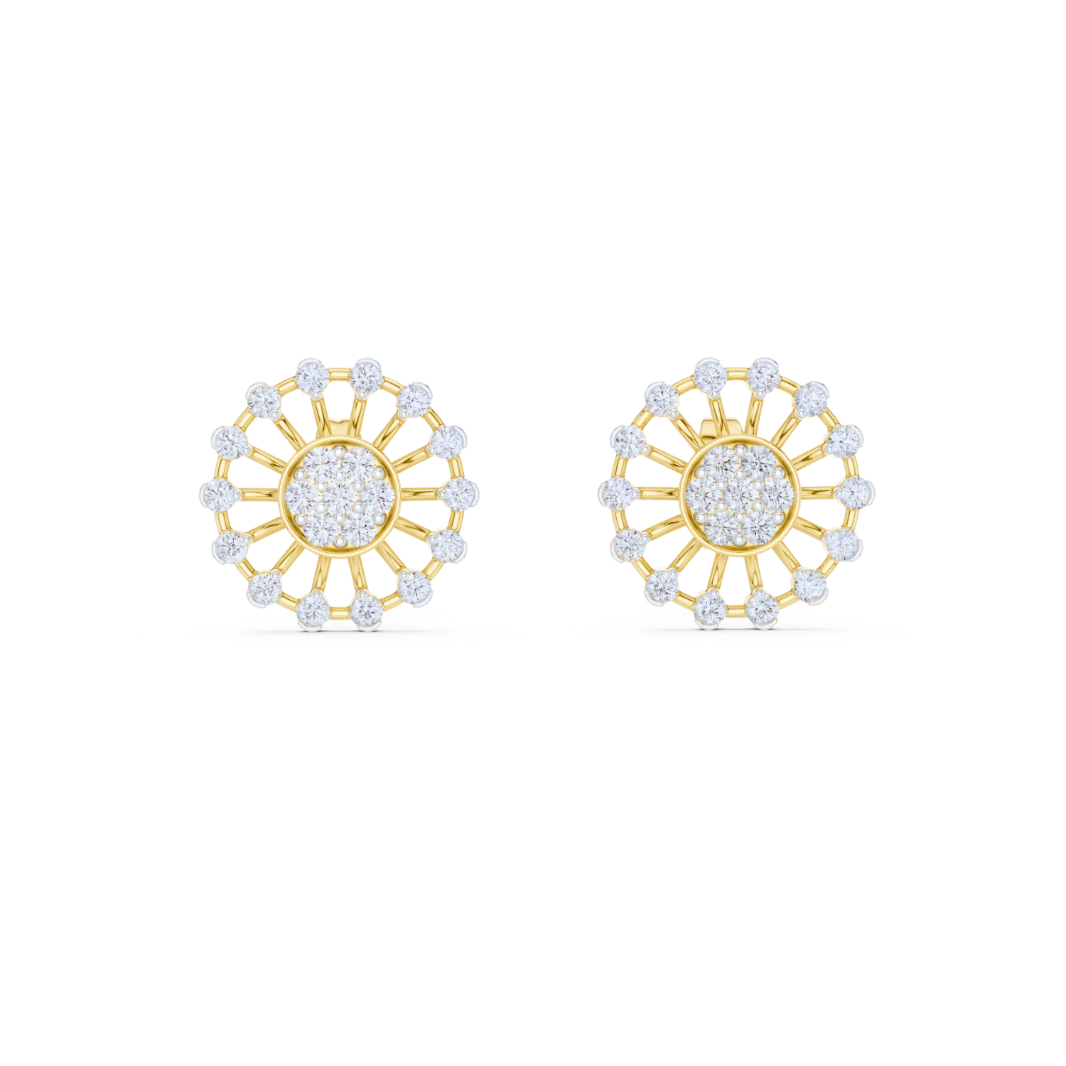 Inspired by the brilliance of the sun, these stunning earrings feature a radiant, openwork design. A dazzling cluster of diamonds forms the centerpiece, while delicate diamond accents encircle the outer frame, mimicking the rays of sunlight.