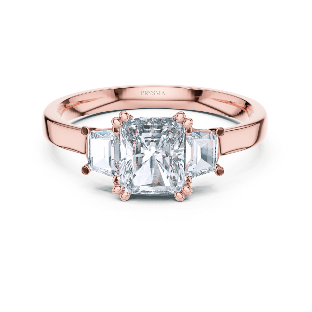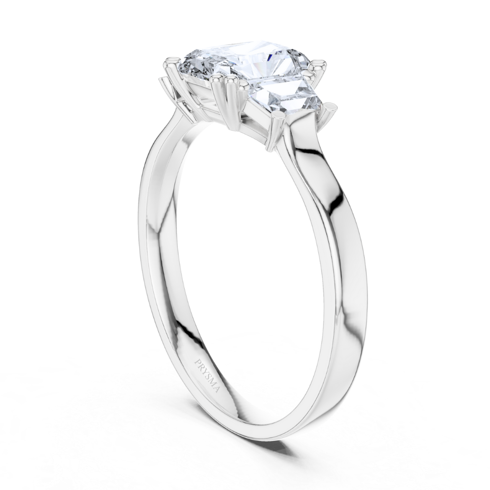 The Radiant Trinity Diamond Ring showcases a dazzling radiant-cut center diamond flanked by two striking trapezoid side stones.this timeless three-stone design symbolizes the past, present, and future — making it a meaningful and sophisticated choice for an enduring love story.