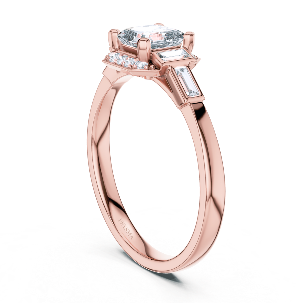 This ring showcases a bold center gemstone flanked by sleek, elongated side stones, all framed with delicate accents for a touch of refined brilliance. The clean lines and meticulous craftsmanship create a perfect harmony of modern sophistication and timeless elegance. An iconic piece that radiates confidence and luxury with every glance.