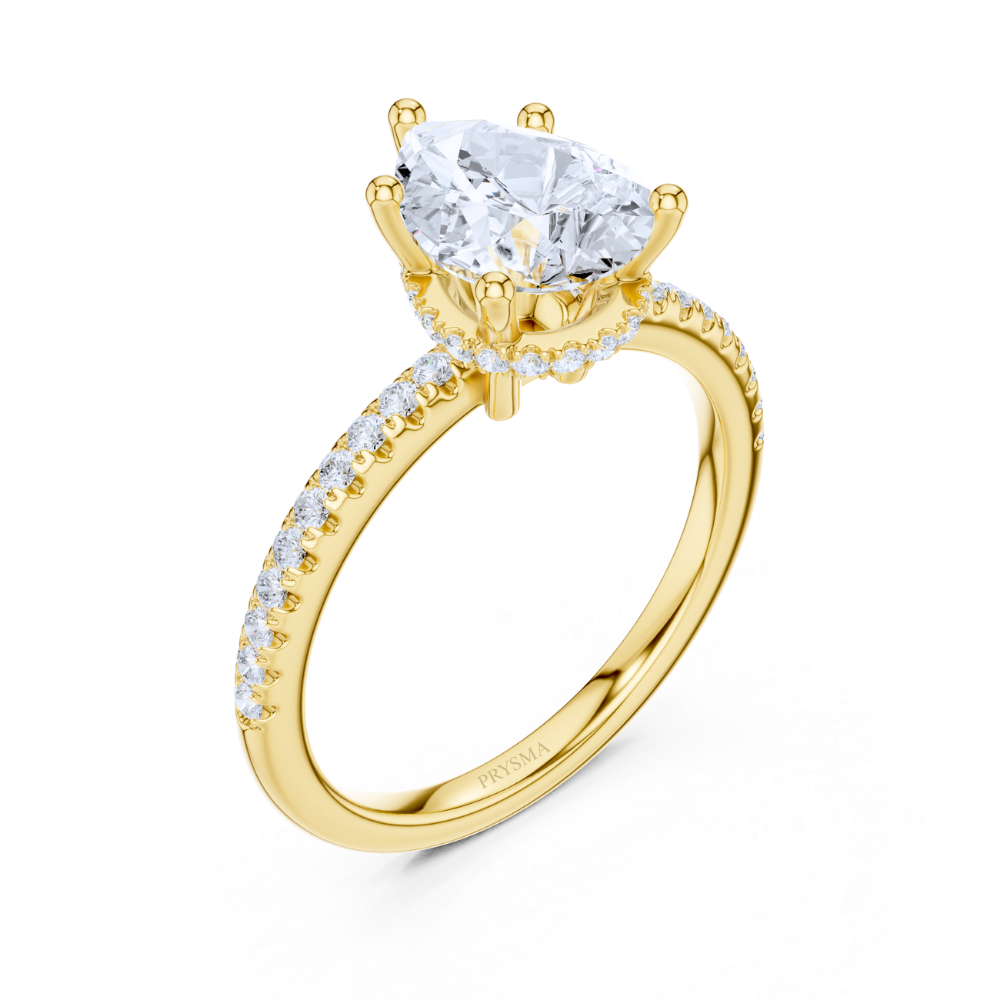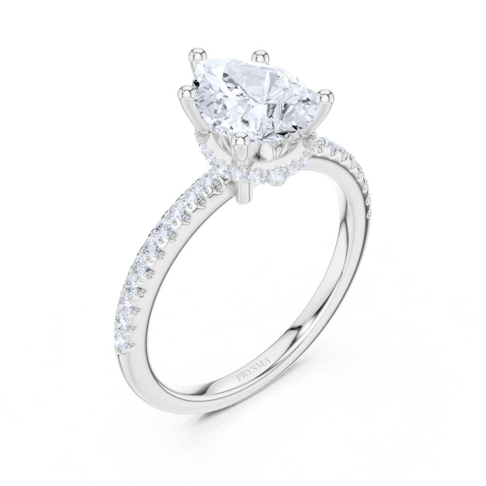 This ring showcases a dazzling pear-shaped center stone, gracefully poised to capture light from every angle. Its slender pavé diamond band adds a refined touch, balancing brilliance with understated sophistication. Crafted to perfection in your preferred precious metal, this ring embodies timeless romance and modern allure.